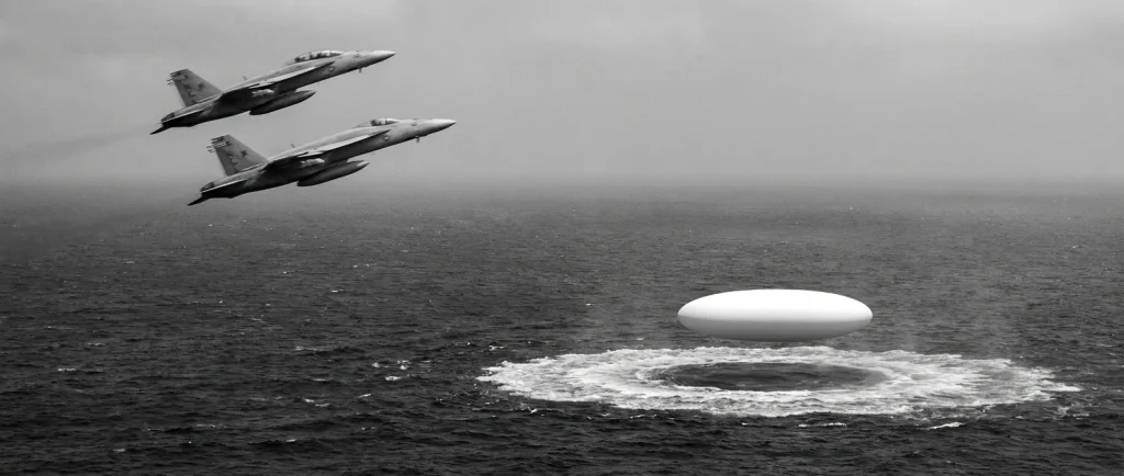 - Visual encounter: The jets were vectored to an area where a disturbance on the ocean surface was reported/observed. Pilots described seeing a white, “Tic Tac”-shaped object maneuvering above the water.