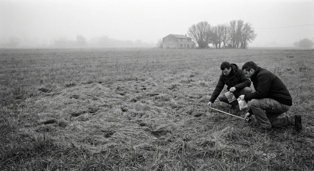Investigators documented ground disturbance consistent with a discrete, bounded event rather than broad agricultural wear. The core observations centered on impressions and disturbed soil: compressed or deformed patches, localized surface disruption, and edges where the ground looked mechanically altered relative to adjacent, apparently undisturbed ground. Where patterns appear organized, the fact that they repeat a geometry is the point, not the exact dimensions. A scuff, rut, or plow mark trends linear and continuous; a landing trace is persuasive only when the disturbance is spatially coherent and internally consistent.